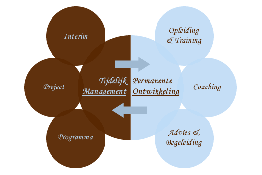 De activiteiten op het vlak van meervoudig veranderen zijn binnen Oxforthec Change in twee ‘lijnen‘ vervat: Tijdelijk Management & Permanente Ontwikkeling. Twee lijnen omdat het verschillende kijkwijzen, denkwijzen en handelswijzen in zich heeft. Ze zijn dus gescheiden in ‘wat ze doen'. Aan de andere kant liggen deze twee lijnen in elkaars verlengde en kunnen ze elkaar ondersteunen en versterken. ‘In theorie' dus gescheiden om ze vervolgens in de praktijk te verbinden. Een verbinding die ook echt Oxforthe Change is.